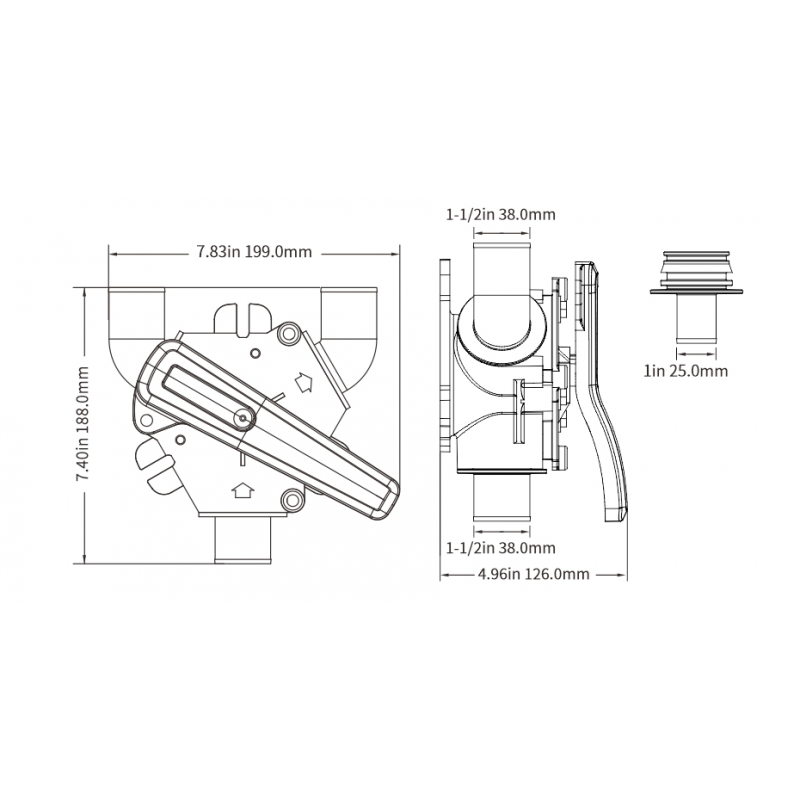 Conforme à la description. L’entrée à 25mm nous permet d’économiser une augmentation de taille à 38 : 2 vannes 3 voies très utiles pour connecter un wc électrique soit vers le passe-coque, soit en dérivation entrée et sortie de notre Electro-Scan…