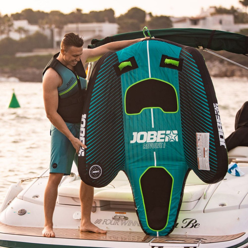 La bouée Jobe Revolve est conçue pour 1 personne. Grâce à ses coussinets et ses poignées en néoprène, vous gagnez en stabilité. Cette bouée est résistante car elle est composée d'une housse en néoprène de 420 deniers, et d'un PVC de 0.6 mm d'épaisseur. Ces deux ailes offrent des sensations extrême lors du décollage. Son système d'accroche rapide vous permet d'attacher (ou de détacher) rapidement votre corde à votre bouée, sans aucun outil ou accessoire supplémentaire.