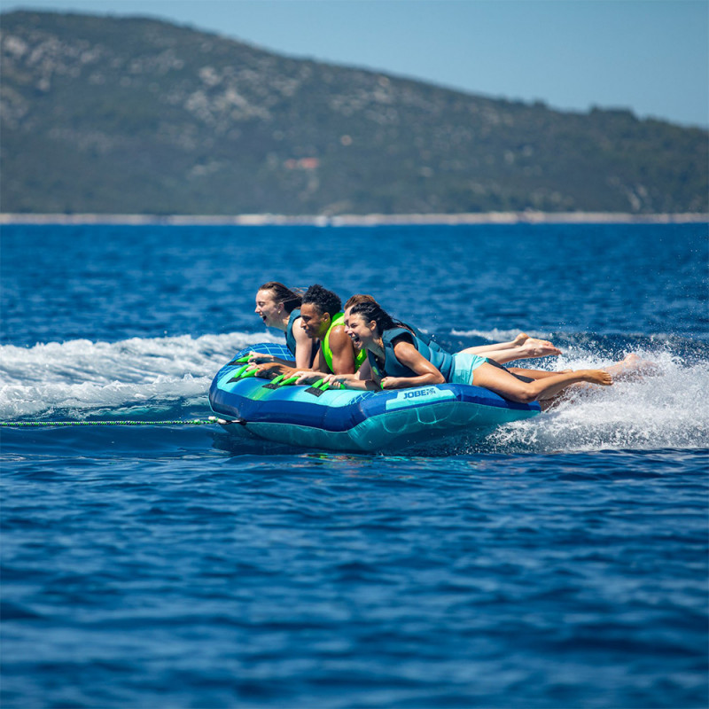 Une véritable plateforme de fun, conçue pour des aventures tractées sans limites à quatre. À gonfler facilement grâce à sa valve Boston et à transporter sans effort une fois pliée.