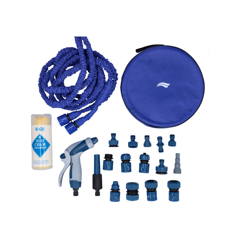 - Un tuyau extensible bleu de 30 mètres (diamètre 12 mm) avec une pression maximale de 2 bars.
