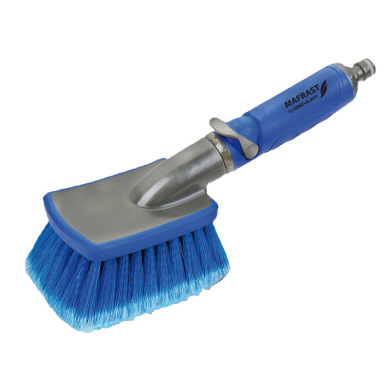 Brosse compacte pour nettoyage de surfaces nautiques, équipée d’un passage d’eau intégré et d’un raccord rapide à clip. Ses poils de dureté moyenne permettent un lavage efficace des ponts, annexes ou moteurs tout en assurant un rinçage continu.