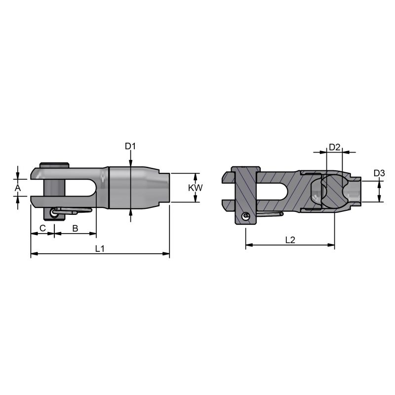 | Diamètre du cordage | Epaisseur A mm | B en mm | C en mm | Largeur D1 mm | Diamètre oeil D2 mm | D3 mm | KW mm | L1 mm | L2 mm | Charge de travail |