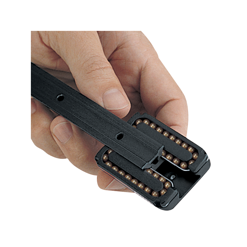 Les chemins des roulements à billes, usinés en aluminium anodisé hardcoat, optimisent les réglages et le choqué. Les barrettes en acier inoxydable maintiennent les billes captives lorsque l’on extrait le chariot du rail.