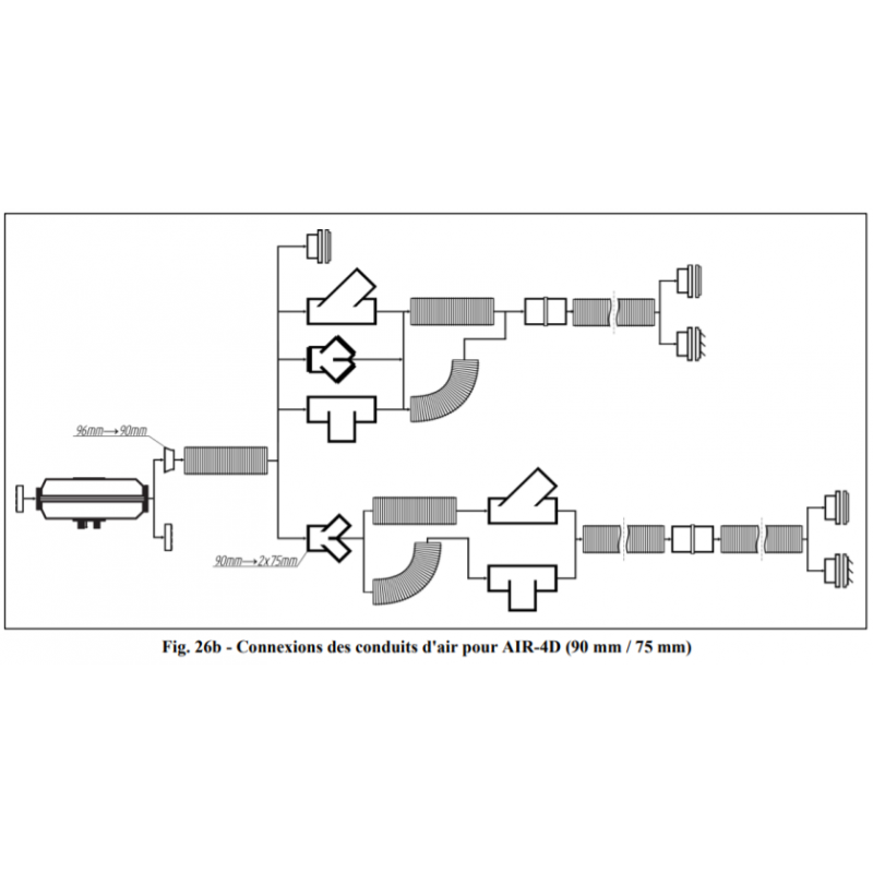 Le système de conduit d'air doit toujours commencer par le diamètre désigné pour le type de chauffage (2D : 60 mm, 4D : 90 mm, 9D : 100 mm), après que ce diamètre puisse être réduit en utilisant différents adaptateurs (voir Fig. 6b/c). L'utilisation de diamètres plus petits que ceux désignés pour le démarrage du système, à la sortie d'air chaud de l'appareil, entraîne une surchauffe de l'appareil de chauffage. Le premier mètre du conduit d'air doit être aussi droit que possible et au diamètre du chauffage .
