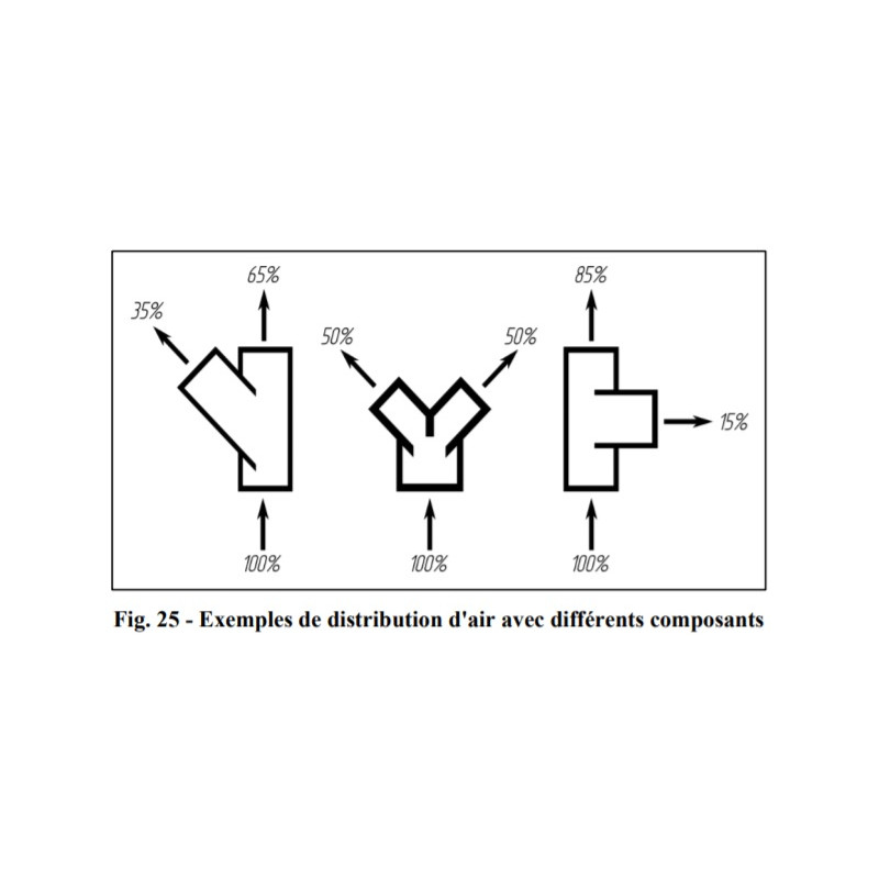 Information : Des adaptateurs en T ou Y peuvent être ajoutés au conduit d'air du chauffage pour distribuer l'air chaud (Fig. 26). Les adaptateurs réduisent le débit total d'air chaud (Fig. 25). Afin de vous assurer que l'option que vous avez sélectionné pour l'installation des conduits d'air est acceptable et n'entraînera pas une réduction massive du débit d'air chaud ou une surchauffe du l'appareil de chauffage, vous devez considérer la distribution de l'air avec les différents composants.