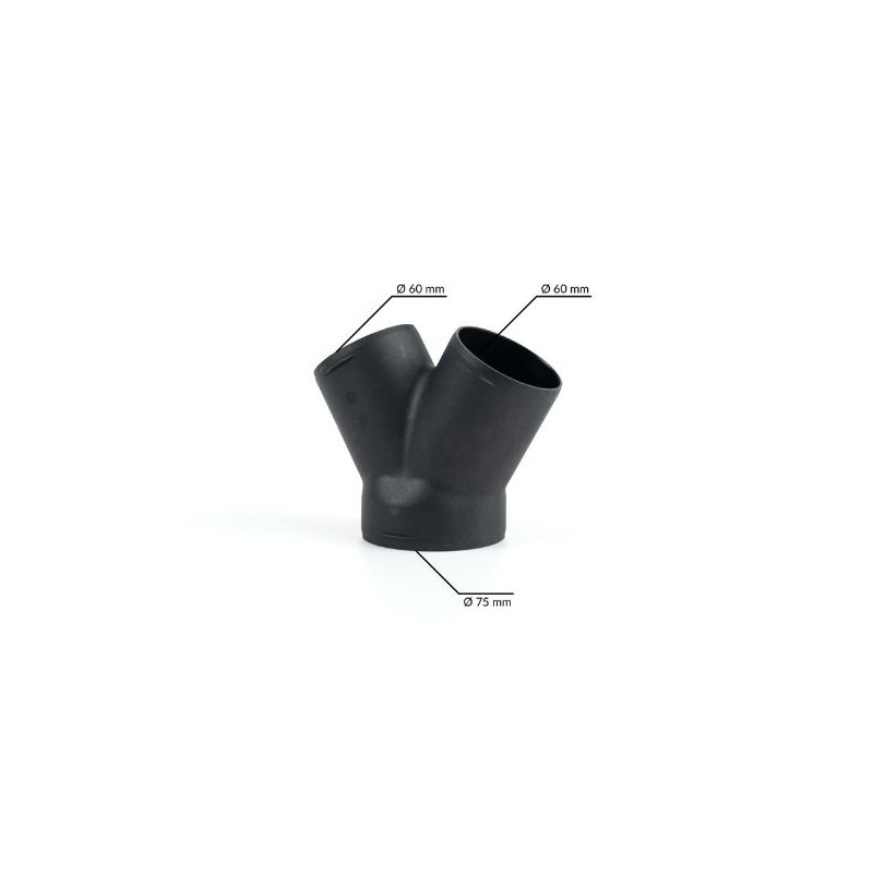 Adaptateur en forme de Y avec angle 120°C pour gaine de chauffage Ø 75 mm (DE014) et gaine de chauffage Ø 60 mm (DE013).