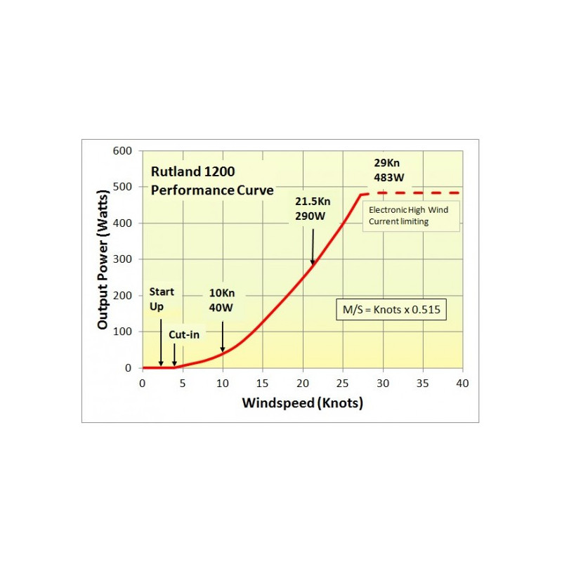 Le contrôleur MPPT permet au Rutland 1200 de commencer à charger à des vitesses de rotor très faibles dans des brises douces à partir de seulement 2,5 m/s ou 5 nœuds. Il garantit que l'énergie est capturée dans les vitesses de vent faibles à moyennes les plus typiques rencontrées quotidiennement.