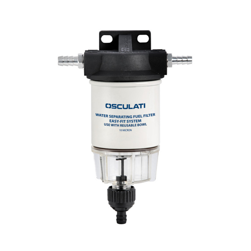 Filtre sélecteur combiné eau/carburant à cartouche 10 microns, conçu pour moteurs hors‑bord jusqu’à 200 CV. Tête en technopolymère, bol transparent avec purge rapide et raccords intégrés : filtration efficace et entretien simplifié à bord.