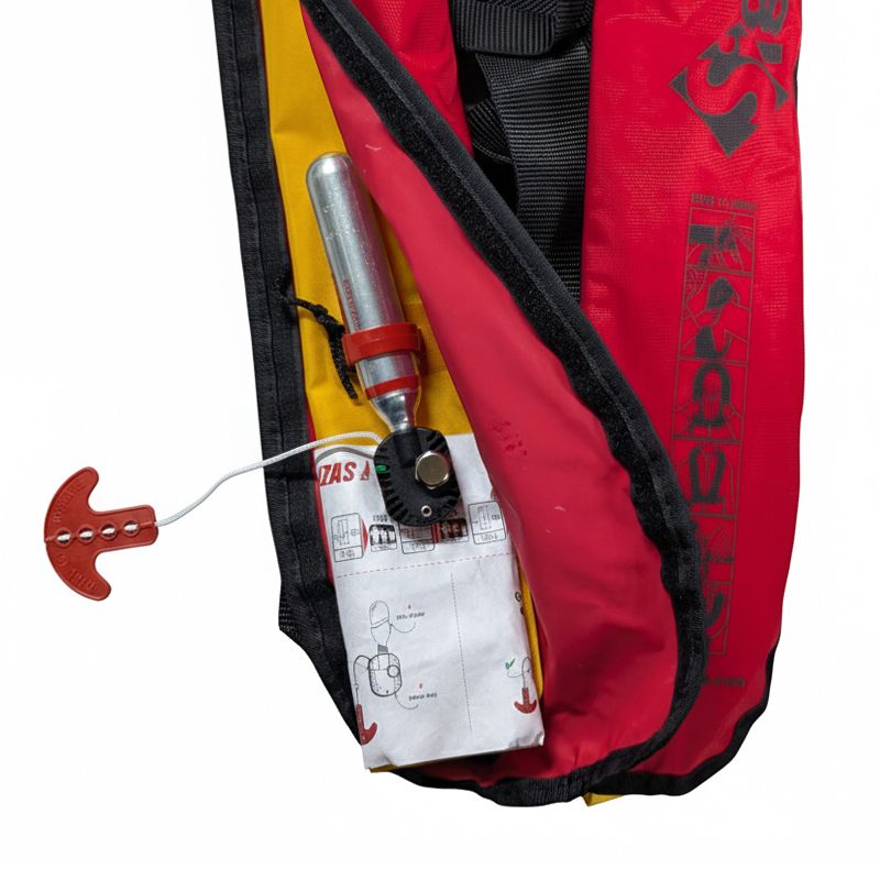 Le déclenchement du système de gonflage est manuel, au moyen d'une tirette. Le mécanisme de percussion de la bouteille de CO2 qui gonfle le gilet s'active en tirant fort sur la poignée du gilet.