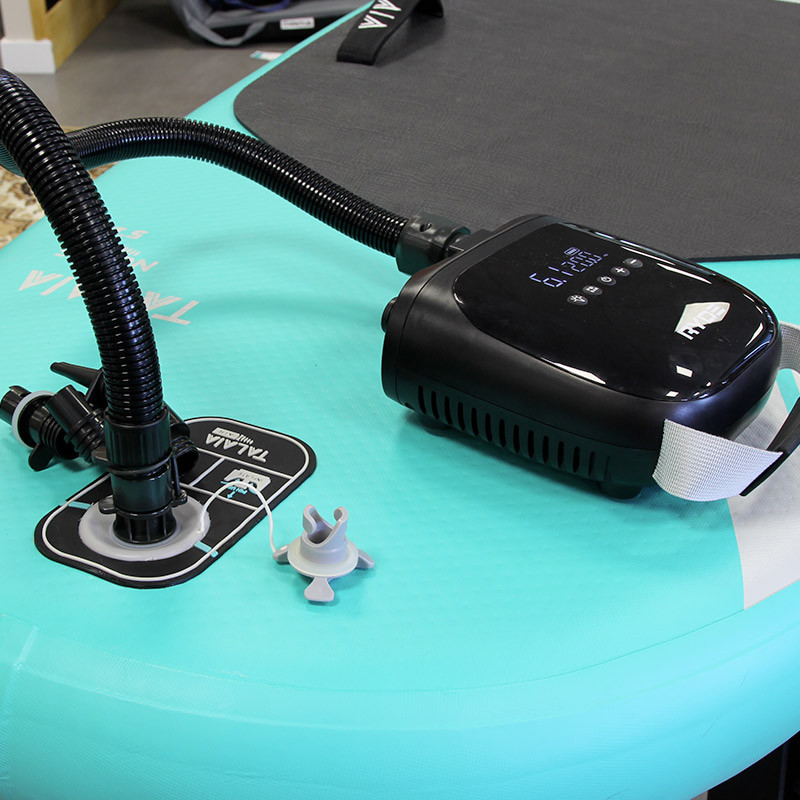 Compatibilité avec tous les SUP (max. 20 PSI) et plusieurs embouts, pour annexes, kayaks, bouées, matelas...