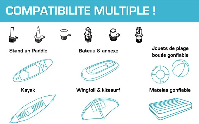 Compatible avec tous les paddles du marché, kayaks, annexes, matelas gonflables, bouées… 6 embouts pour s’adapter à la majorité des valves.