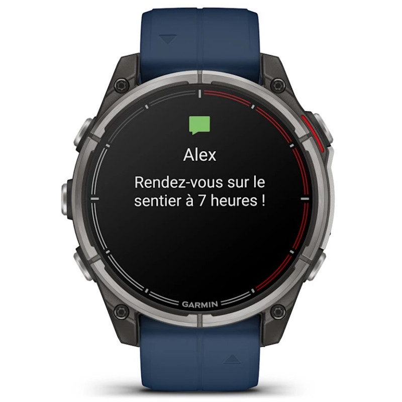 La Garmin Quatix 8 est une montre connectée marine haut de gamme destinée aux navigateurs exigeants. Elle associe un grand écran AMOLED de 51 mm à un design robuste avec lunette en titane et verre saphir, offrant une lisibilité et une résistance optimales pour le milieu marin. Grâce à sa connectivité avancée, elle permet de contrôler votre pilote automatique, accéder aux données du bateau, recevoir des alertes de mouillage, et gérer les fonctions régate en toute simplicité. Elle est équipée d’un haut-parleur et d’un micro intégrés pour passer des appels Bluetooth, utiliser des commandes vocales ou activer des fonctions à distance. Complétée par une lampe torche LED et des capteurs ABC, cette montre est un véritable pilotage embarqué au poignet, tout en assurant des performances sportives avec suivi de santé, GPS multibande et plus de 100 profils d’activité. Son autonomie peut atteindre 29 jours en mode montre connectée, ce qui en fait un allié fiable pour les longues sorties en mer comme au quotidien.