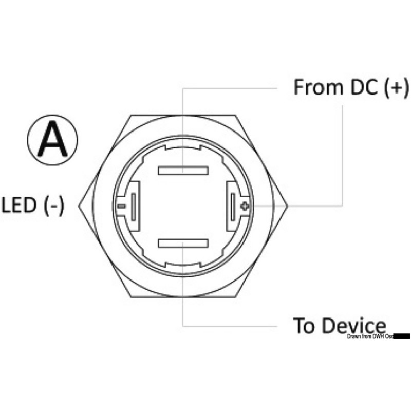 Bouton-poussoir automatique plat ON‑OFF, boîtier en acier inox AISI 316, LED blanche, étanche IP67, conçu pour circuits 12 V – durable et performant.