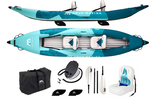 Le kayak gonflable Aquamarina Betta 2 personnes est un kayak très accessible pour des balades en couple ou entre amis. Un kayak gonflable résistant grâce à sa fabrication en PVC renforcé qui saura durer dans le temps et vous apporter tout le confort nécessaire avec ses cales pieds et ses fauteuils gonflables.