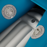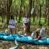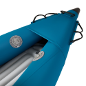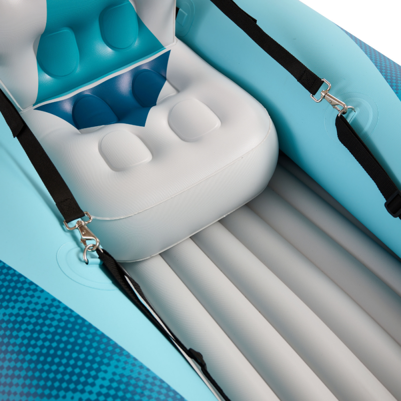 Le kayak est conçu en PVC renforcé avec plancher gonflable en I-beam pour une meilleure rigidité. Les poignées (avant/arrière/centre) simplifient la manutention, et les anneaux en D permettent d’ajuster la position des sièges.