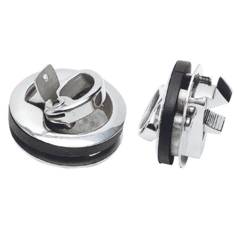 Poignée encastrable flush en acier inox AISI 316 poli miroir, équipée d’une serrure à clé et d’une butée carrée. Pour panneaux de 5 à 12 mm d’épaisseur, offre une fermeture fiable et sécurisée, tout en étant résistante à la corrosion marine.