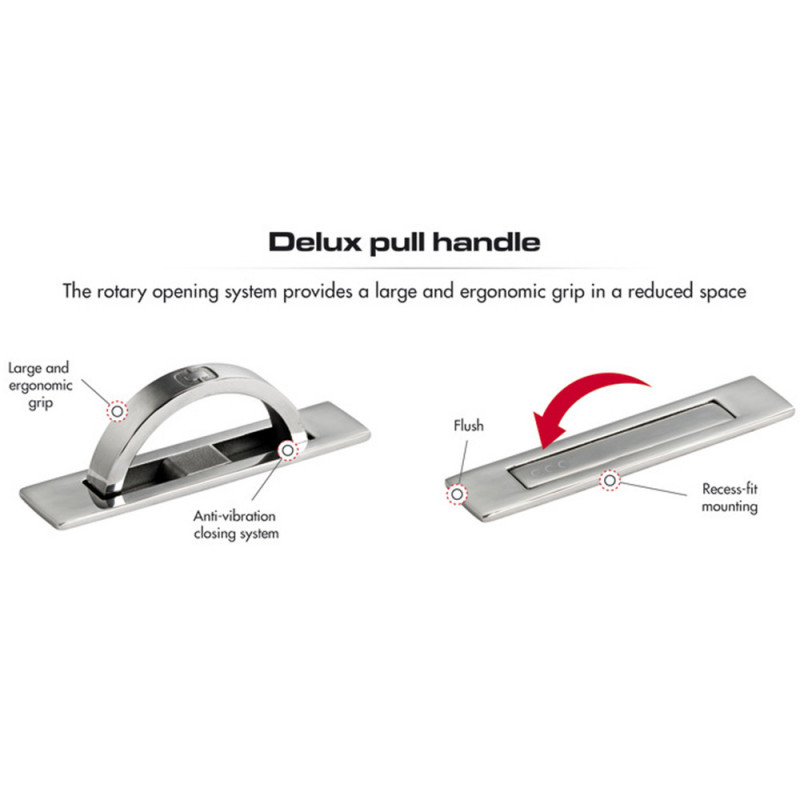 Poignée encastrable compacte en acier inox AISI 316, dotée d’un système d’ouverture rotatif ergonomique. Idéale pour installation affleurante avec prise ferme même dans les espaces restreints. Équipée d’un mécanisme anti‑vibrations pour une fermeture silencieuse et stable.