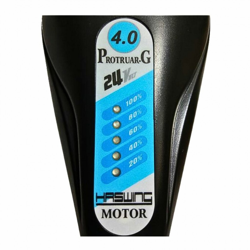 Haswing Protruar 4.0 G est un nouveau modèle dans l'offre du constructeur, avec une alimentation 24V et une puissance de 1800 W. Il dispose d'un moteur sans balais, appelé aussi « brushless » avec une traction de 130 lbs à 1 100 tr/min et un rendement extrêmement élevé. Son couple est important. La puissance du moteur est transféré à l'hélice à l'aide d'une pignonnerie, appelé réducteur . Sa poignée d’accélération vous permet de régler la vitesse de manière très précise et permet d'économiser considérablement la consommation d'électricité. Parfait pour les pêcheurs, ce modèle a un arbre en acier inoxydable, et la hauteur du moteur peut être ajustée sur toute sa hauteur. Le support moteur, dit presses de fixation, est en métal durable, solide et léger. Le matériau utilisé pour le support arrière (presses de fixation) évitera toute rouille. Il y a différentes possibilités de régler le moteur par rapport au tableau arrière, et d’ajuster sa profondeur d'immersion. La barre franche est dotée d'une clef de sécurité, dont l’extrémité du cordon peut être attachée, par exemple, à un gilet de sauvetage.
