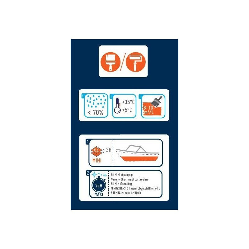 Ce PRIMAIRE d’ORANGEMARINE est utilisable pour les zones immergées. Il permet d’obtenir une surface idéale avant l’application d’antifouling. Il offre également une protection anticorrosion dans un environnement agressif notamment pour les lests et les quilles.