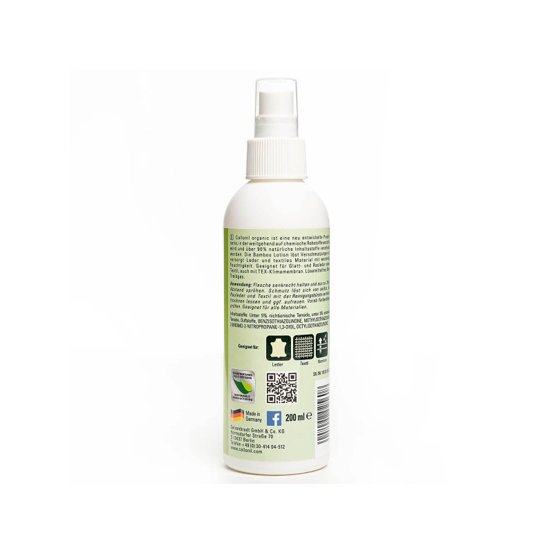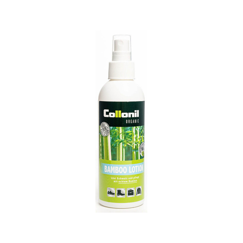 La lotion de nettoyage Bamboo de chez Collonil est une lotion qui élime saletés, hydrate le cuir, le denim, et les associations de matières textiles. La lotion contient de l'extrait naturel de bambou permettant de former une barrière de détergence ce qui préserve le matériau contre le dessèchement. Elle est produite sans gaz propulseurs et proposé dans un vaporisateur.