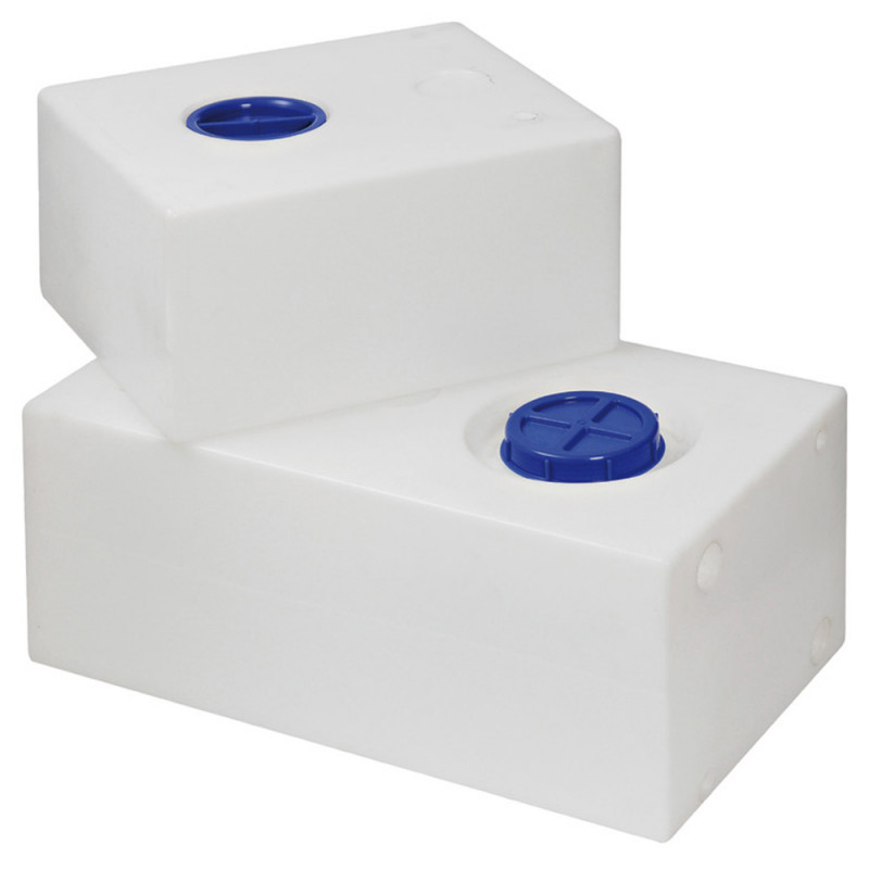 Réservoirs rigides en polyéthylène alimentaire blanc, conçus pour stocker l'eau potable à bord (coque ou sous la couchette avant). Chaque modèle est équipé de quatre trous taraudés borgnes pour raccordement de remplissage, vidange ou ventilation (non inclus).