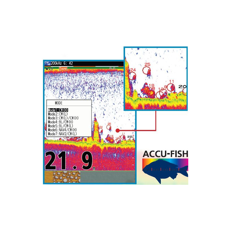 - Technologie ACCU‑FISH™ pour estimation instantanée de la taille des poissons (10–199 cm, à 2–100 m)