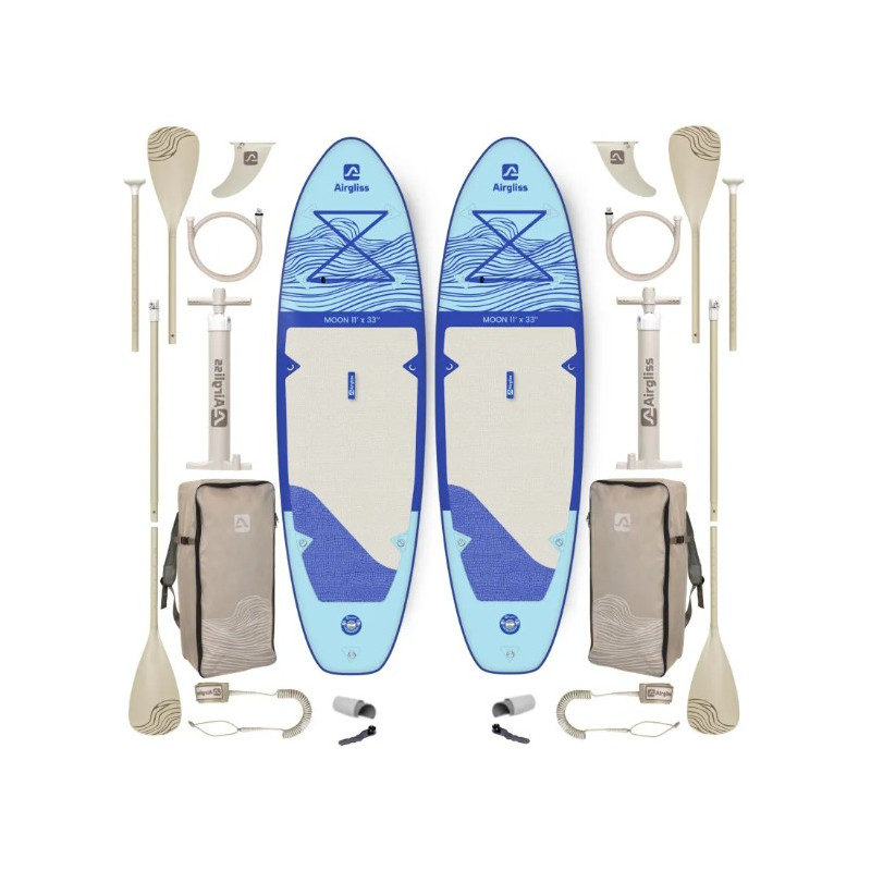 Ce pack inclut 2 paddles Airgliss Moon 11’0 complets : il permet de naviguer à deux avec un équipement identique, idéal en mer calme, lac ou rivière.
