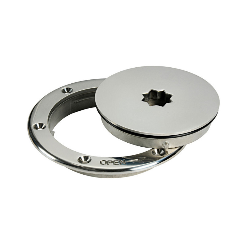 Trappes étanches robustes en inox marin AISI 316, avec système d’ouverture rapide à 1/4 de tour compatible manivelle winch (non incluse). Le capot reste fixé à la poignée pour un retrait facile. Adaptées aux accès de pont, coffres ou compartiments.