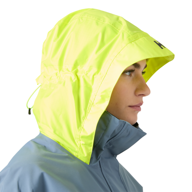 Son col haut doublé polaire protège efficacement contre les embruns, tandis que la capuche jaune fluorescente repliable assure une excellente visibilité en mer. Les poignets à double serrage empêchent l’eau de pénétrer, et la coupe féminine garantit un confort optimal.